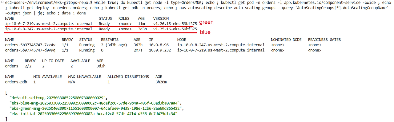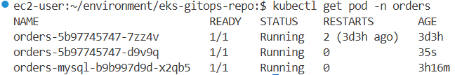 argocd/orders https://kubernetes.default.svc default Synced Progressing Auto-Prune <none> https://git-codecommit.us-west-2.amazonaws.com/v1/repos/eks-gitops-repo apps/orders green