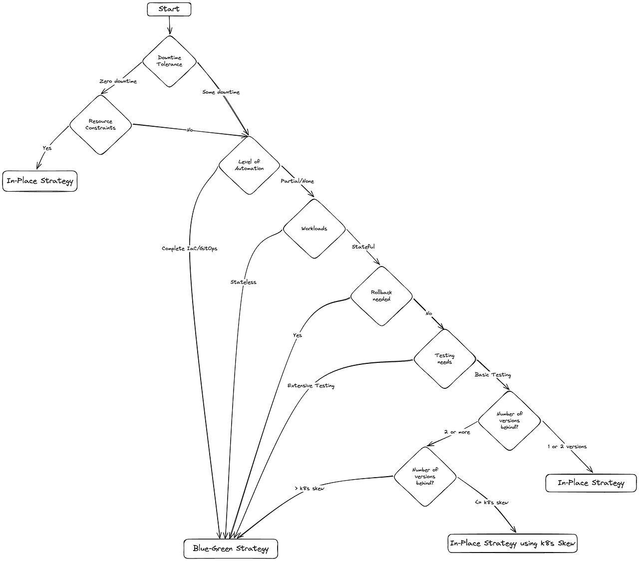 다음과 같은 의사결정 트리를 참고하여 본인의 환경에 맞는 배포전략이 어떤 것인지 참고 하면 좋을듯 합니다.