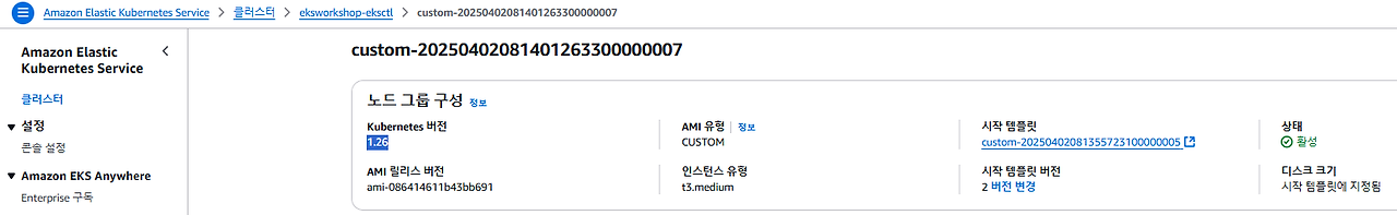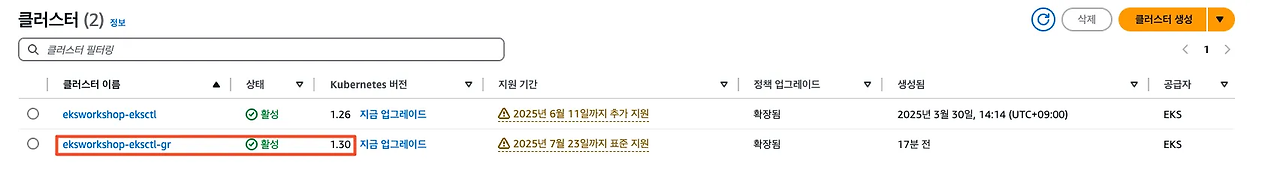 eksworkshop-eksctl-gr 이름의 1.30 버전 클러스터가 생성된 것을 확인할 수 있습니다.