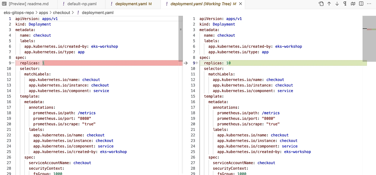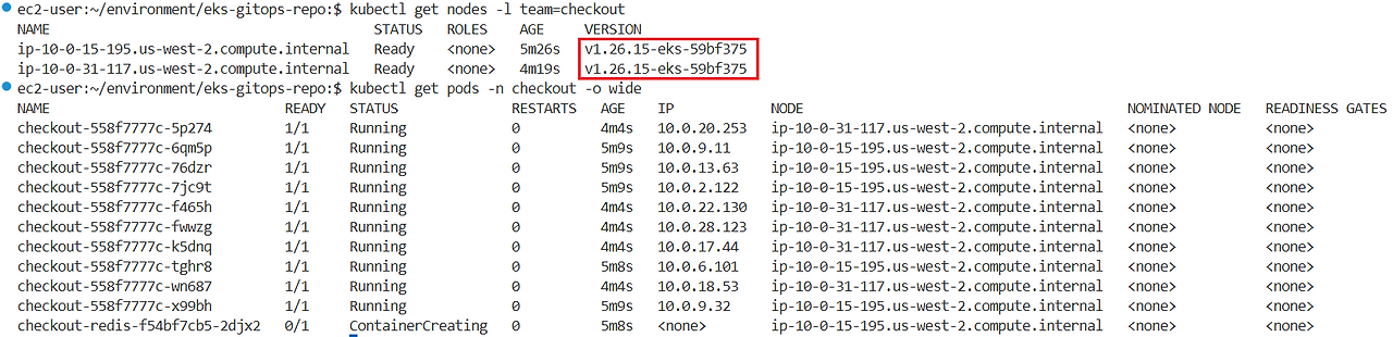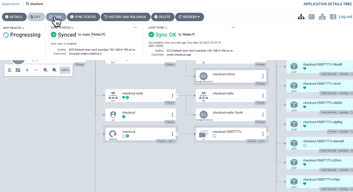 argocd/checkout https://kubernetes.default.svc default Synced Progressing Auto-Prune <none> https://git-codecommit.us-west-2.amazonaws.com/v1/repos/eks-gitops-repo apps/checkout green
