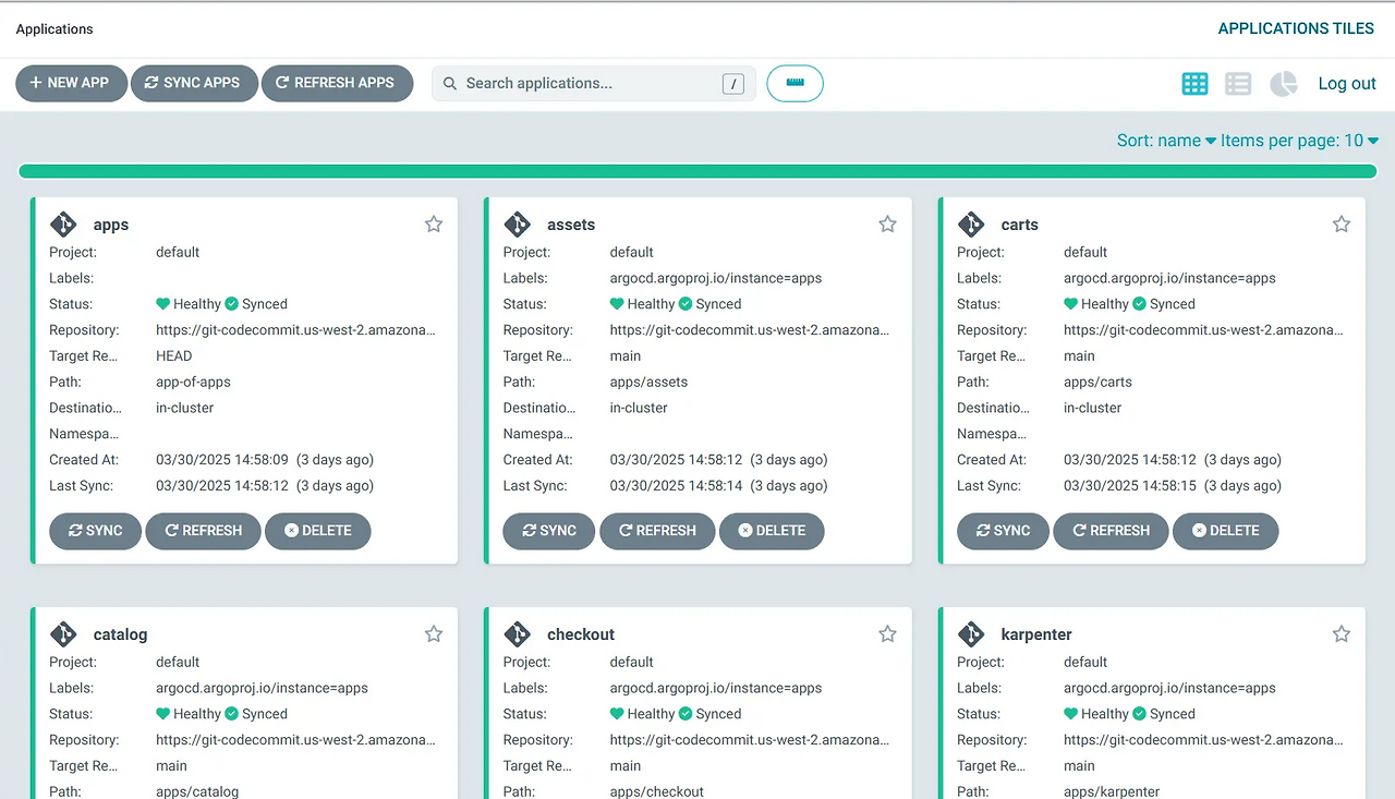 argocd/carts https://kubernetes.default.svc default Synced Progressing Auto-Prune <none> https://git-codecommit.us-west-2.amazonaws.com/v1/repos/eks-gitops-repo apps/carts green