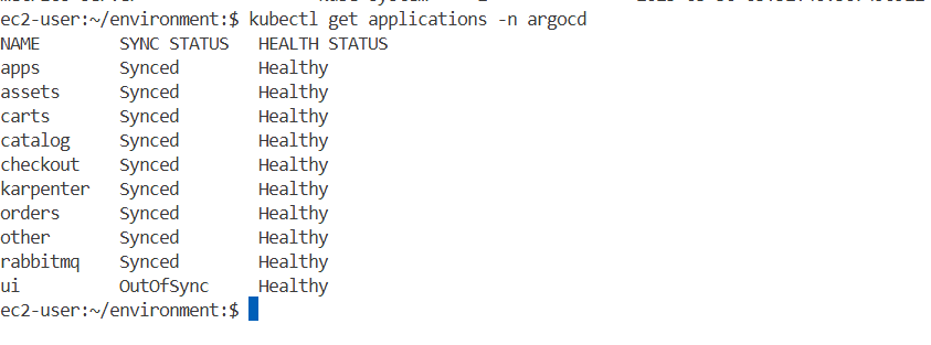 argocd/ui https://kubernetes.default.svc default Synced Progressing Auto-Prune <none> https://git-codecommit.us-west-2.amazonaws.com/v1/repos/eks-gitops-repo apps/ui green