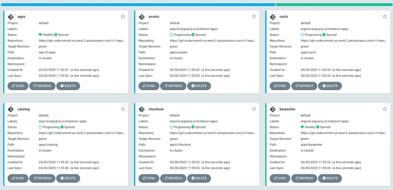 argocd/catalog https://kubernetes.default.svc default Synced Progressing Auto-Prune <none> https://git-codecommit.us-west-2.amazonaws.com/v1/repos/eks-gitops-repo apps/catalog green