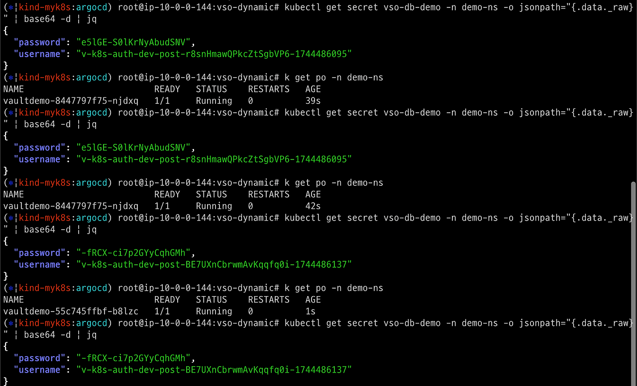 while true; do kubectl get pod -n demo-ns ; echo; kubectl view-secret -n demo-ns vso-db-demo --all; date; sleep 30 ; echo ; done