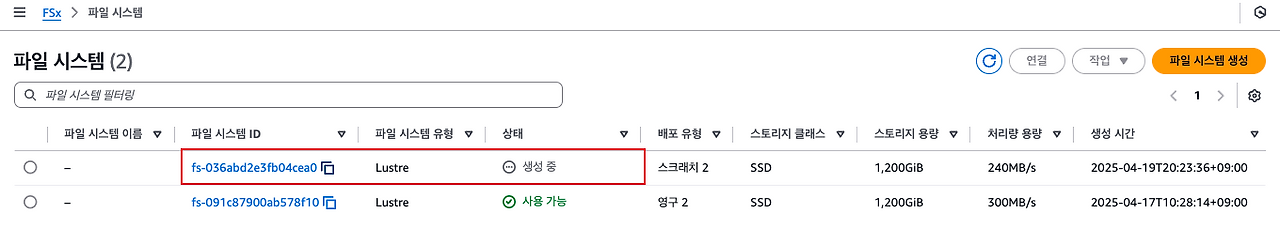 처리량(Throughput): 파일 시스템 크기에 비례합니다. 현재는 1.2TiB로 구성되어 있으므로 일반적으로 평균 약 240MB/s 정도의 쓰루풋이 나옵니다. FSx for lustre 구성별로 성능에 대한 기준표는 다음 링크를 참고 바랍니다. 🔗