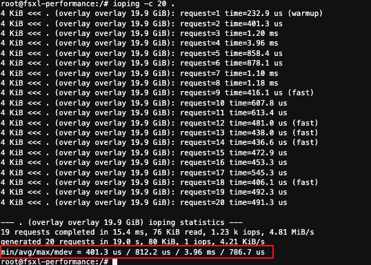 ioping 결과 일반적으로 < 0.5ms(500us)인 평균 지연 시간을 기록합니다. 이는 FSx for Lustre 파일 시스템의 낮은 지연 시간과 높은 성능을 보여줍니다.
