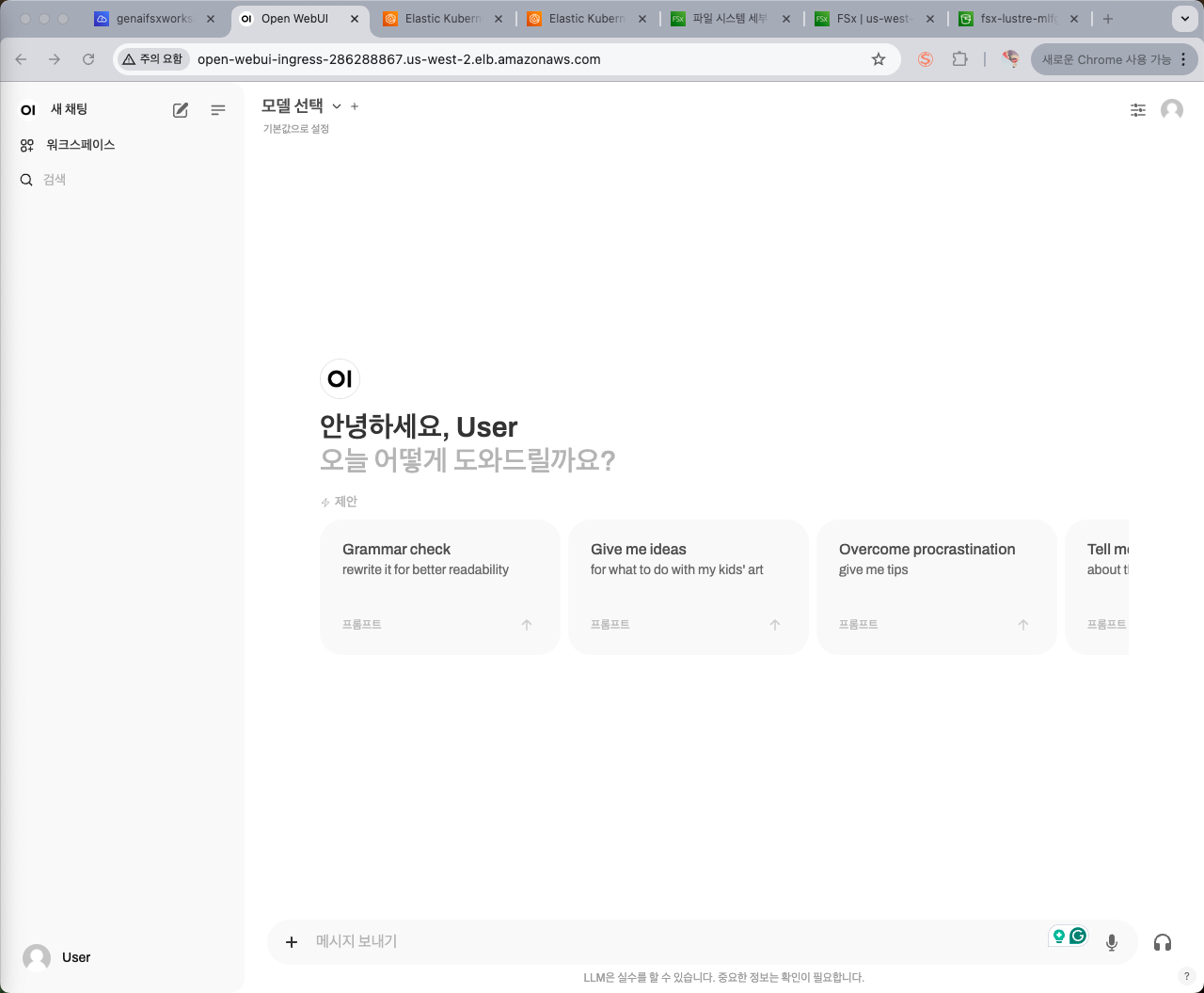 - Overall: Amazon EKS 클러스터에 vLLM과 WebUI 파드를 배포하여 생성형 AI 챗봇 애플리케이션을 Kubernetes 환경에서 구축합니다.